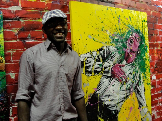 Though often starting from a sketch, he said “when I go to put it on the canvas I just let the canvas be itself until the work is complete. I’m not in control of what it’s going to be. Sometimes I’m guided by personal life experience, or by music, or just by the aura that surrounds me.” He works in acrylic and mixed media but mostly spray paints. Pefung, who has a Hot Shops studio, does diversion work with kids to channel them from destructive graffiti to positive modes of expression. Part of the proceeds from sales of his art go to his foundation that supports young people in West Africa.