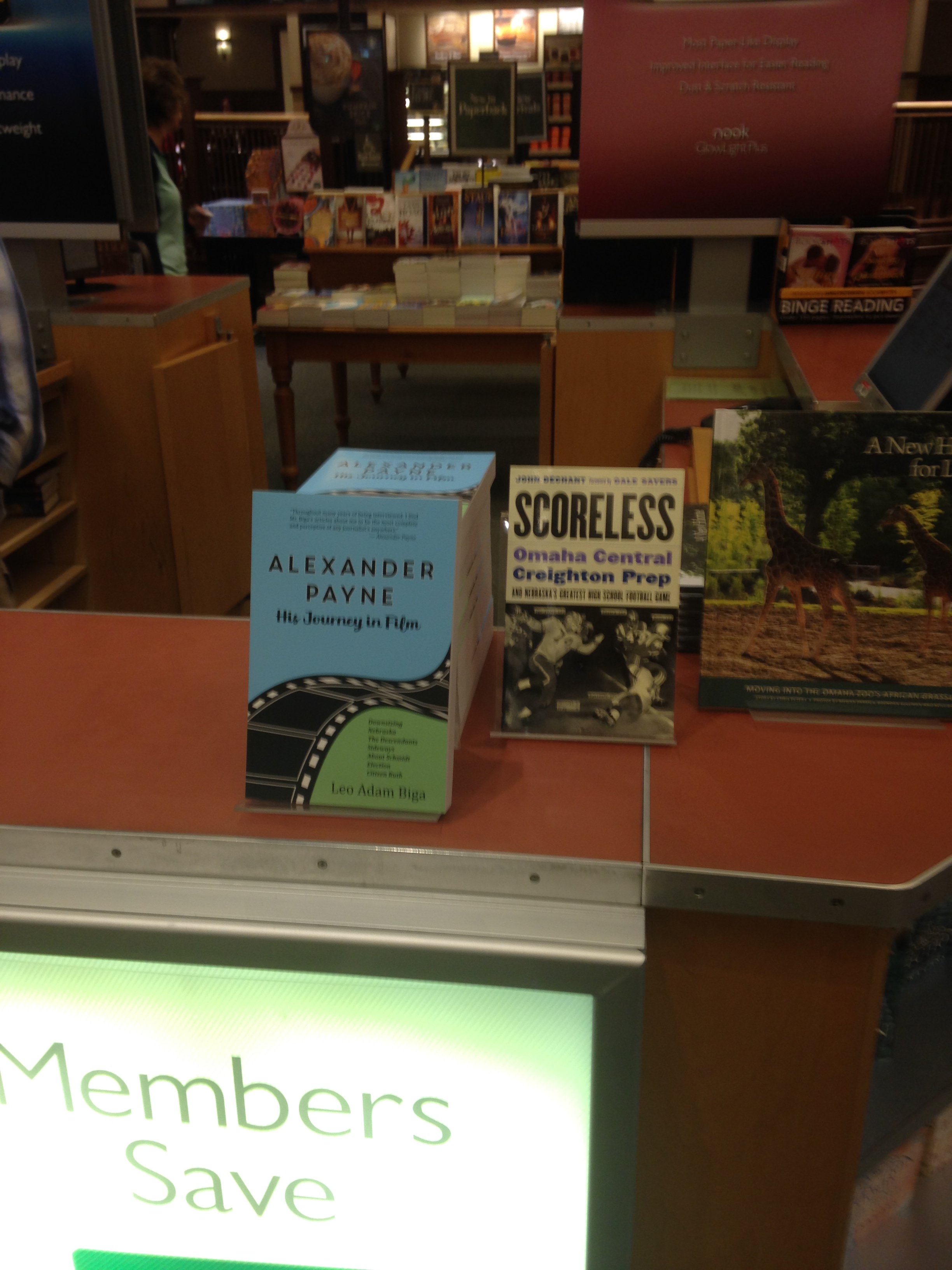 My Alexander Payne book is getting lots of love from the book guys and gals at the Oakview Barnes & Noble store in Omaha. They’ve kindly placed the book at the customer service counter for some prime store placement. “Alexander Payne: His Journey in Film” makes a great gift for yourself or for anyone in your life who loves movies, pop culture and reading about the path this Nebraskan has taken to achieve world cinema acclaim.