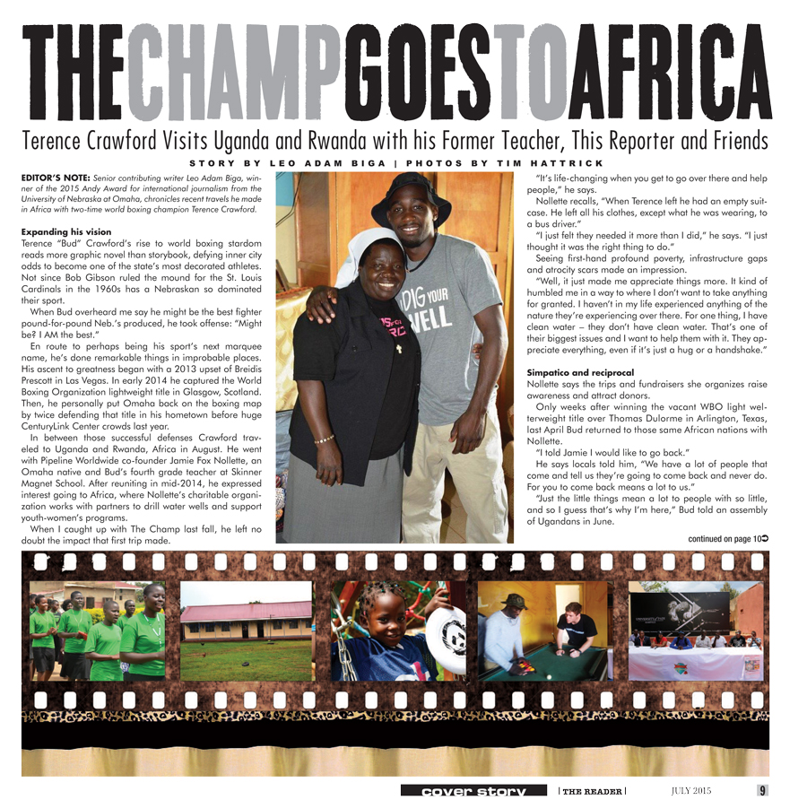 Two-time world boxing champ Terence Crawford of Omaha has the means to do anything he wants. You might not expect then that in the space of less than a year he chose to travel not once but twice to a pair of developing nations in Africa wracked by poverty, infrastructure problems and atrocity scars: Uganda and Rwanda, I accompanied his last trip as the 2015 winner of the Andy Award for international journalism from the University of Nebraska at Omaha. Until now I’ve posted a little about the grant that took me to Africa along with a few pictures and anecdotes from the trip. But now I’m sharing the first in a collection of stories I’m writing about the experience, which is of course why I went there in fhe first place. This cover story in the coming July issue of The Reader (www.thereader.com) emphasizes Crawford within the larger context of what he and the rest of us saw, who we met and what we did. Future pieces for other publications will go even more into where his Africa sojourns fit into his evolving story as a person and as an athlete. But at least one of my upcoming stories from the trip will try to convey the totality of the experience from my point of view and that of others. I feel privilged to have been given the opportunity to chronicle this journey. Look for new posts and updates and announcements related to this and future stories from my Africa Tales series.