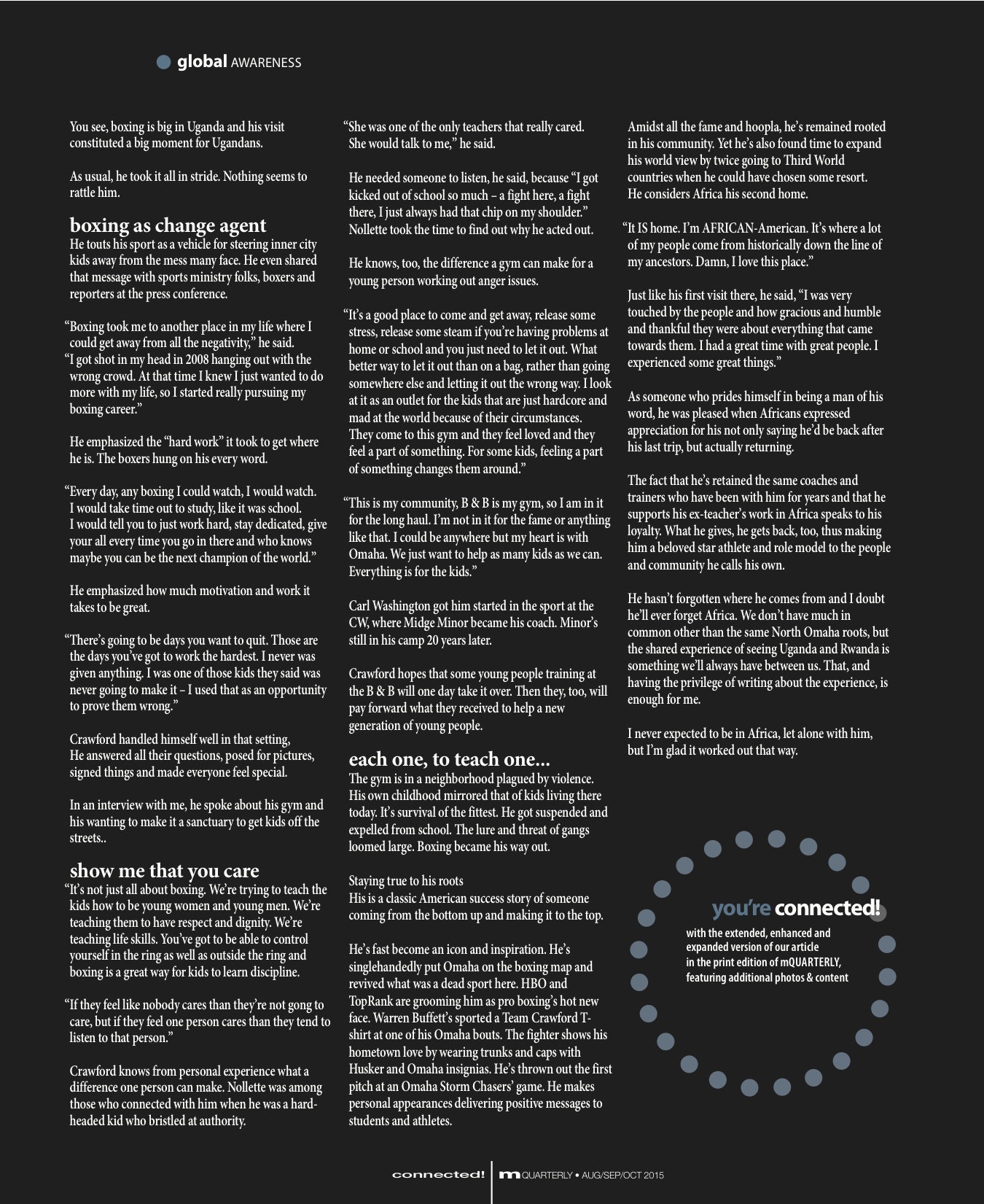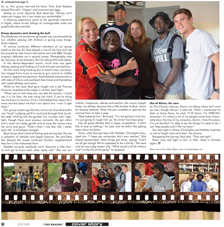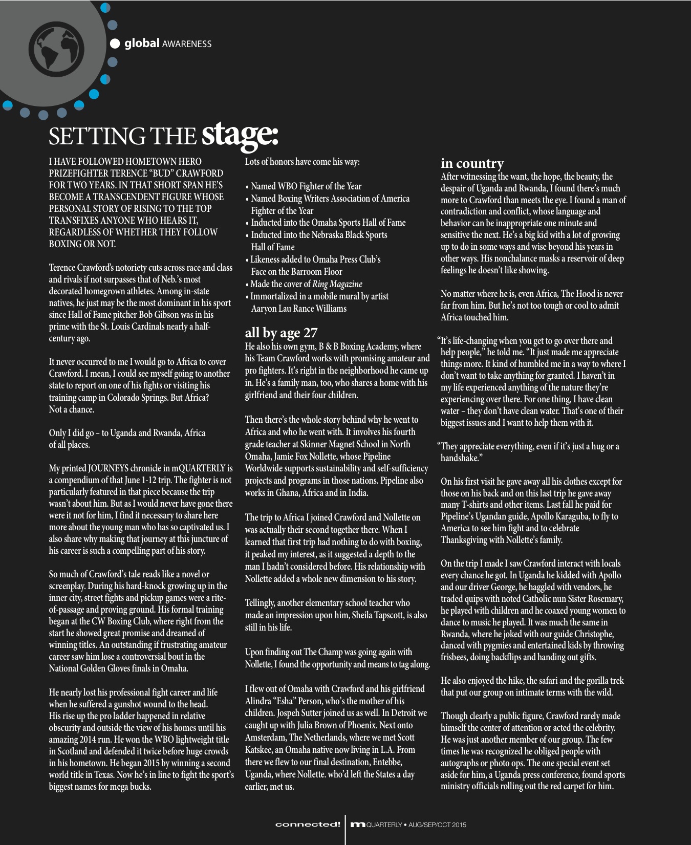 This is the first time I’ve posted the stories I wrote about my travels to Africa with boxing champ Terence “Bud’ Crawford just as they appeared in Metro Magazine (http://www.spiritofomaha.com/Metro-Magazine/The-Magazine/). The publisher and editor generously allotted several pages to this rather epic spread highlighting various facets of the two-week trip to Uganda and Rwanda.