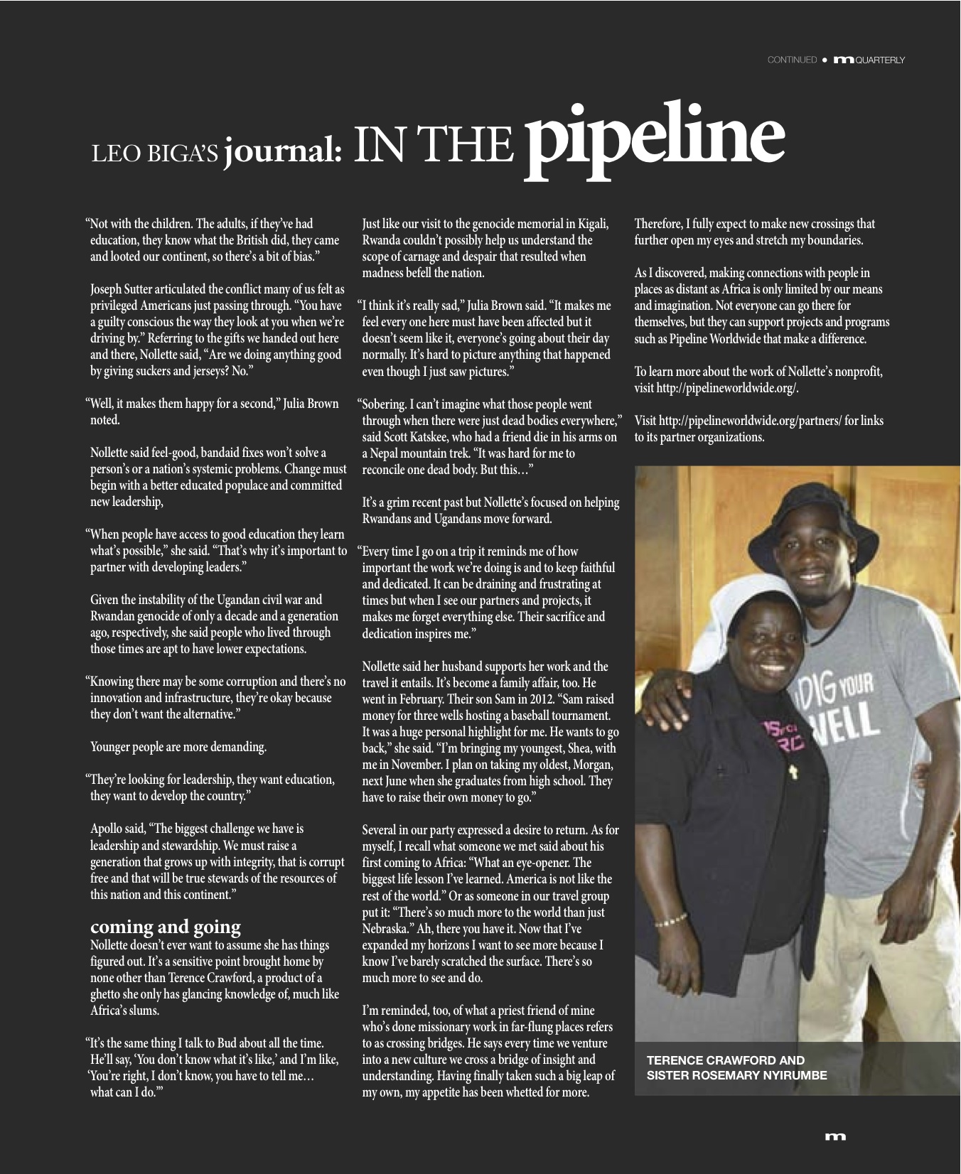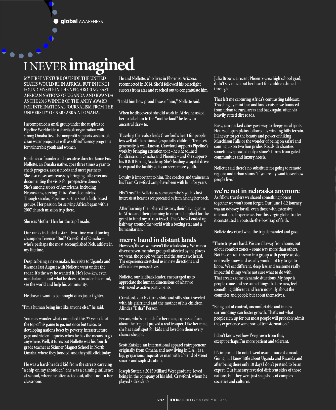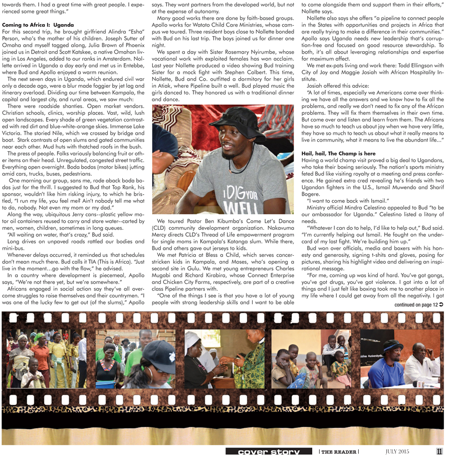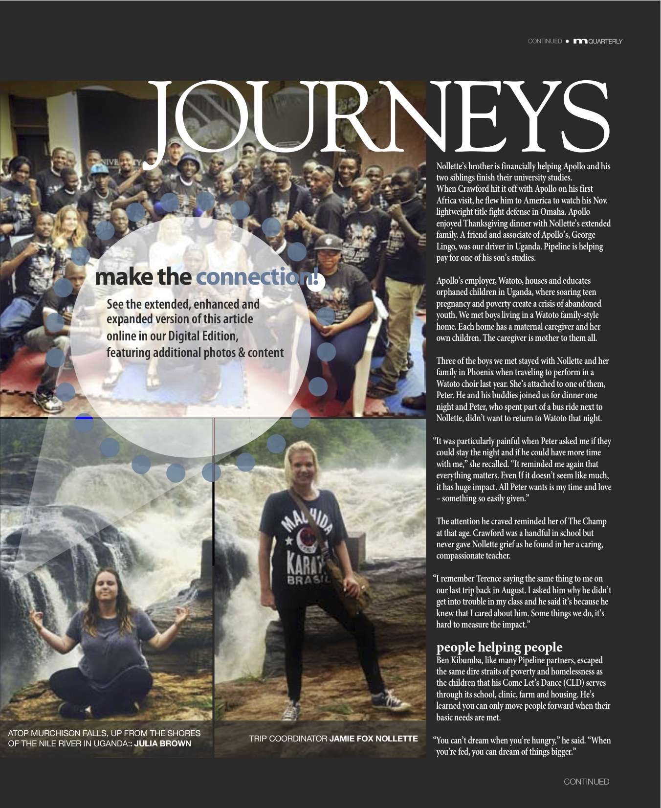 This is the first time I’ve posted the stories I wrote about my travels to Africa with boxing champ Terence “Bud’ Crawford just as they appeared in Metro Magazine (http://www.spiritofomaha.com/Metro-Magazine/The-Magazine/). The publisher and editor generously allotted several pages to this rather epic spread highlighting various facets of the two-week trip to Uganda and Rwanda.