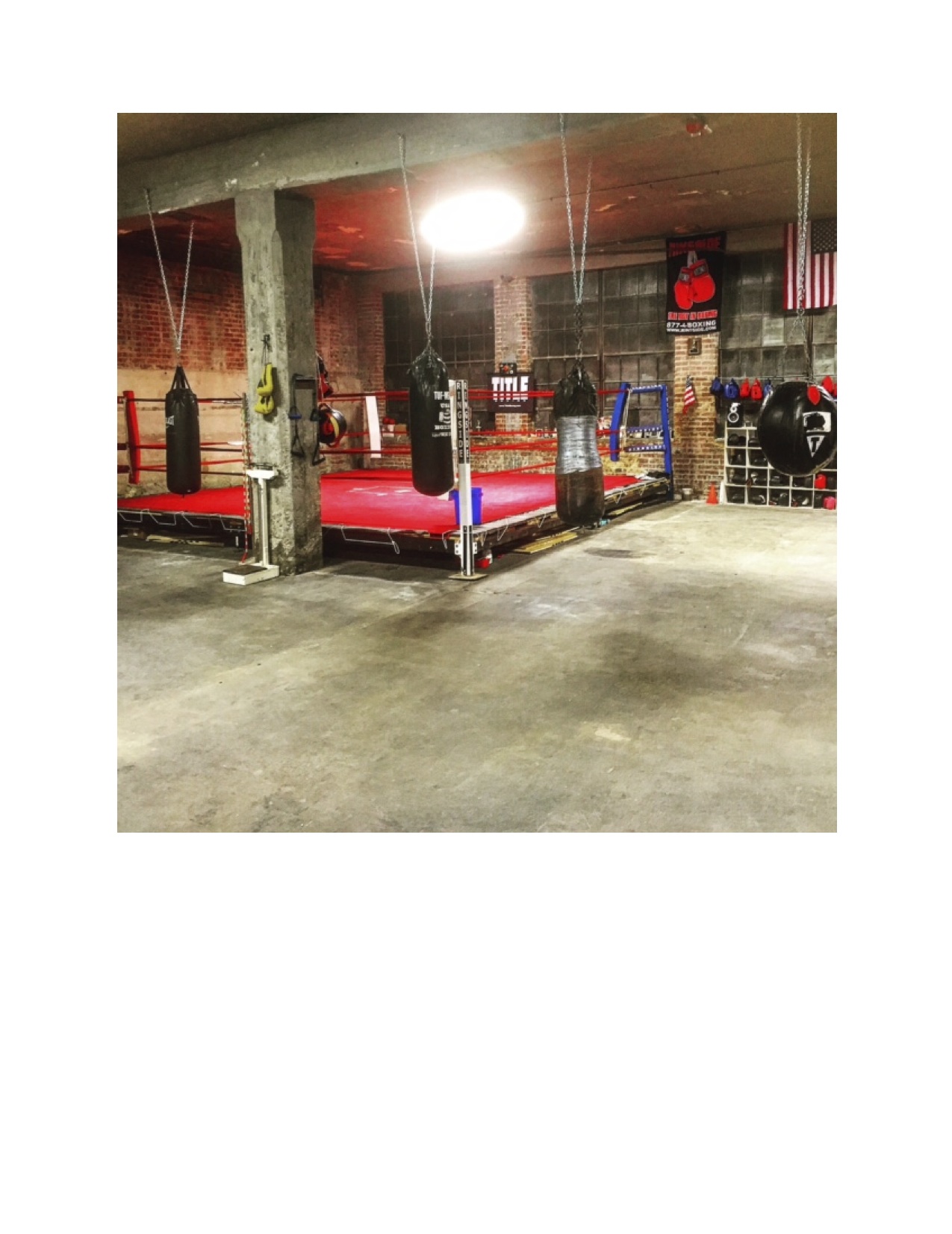 The gym lays out on one level, comprised of tidy work stations – the largest of which is a makeshift ring. Two medicine balls sit against a ring post. Outside the ropes four heavy bags hang in a row – like sides of beef – from chains fastened to the ceiling’s metal crossbeam. Speed bags stand at opposite ends of the room.