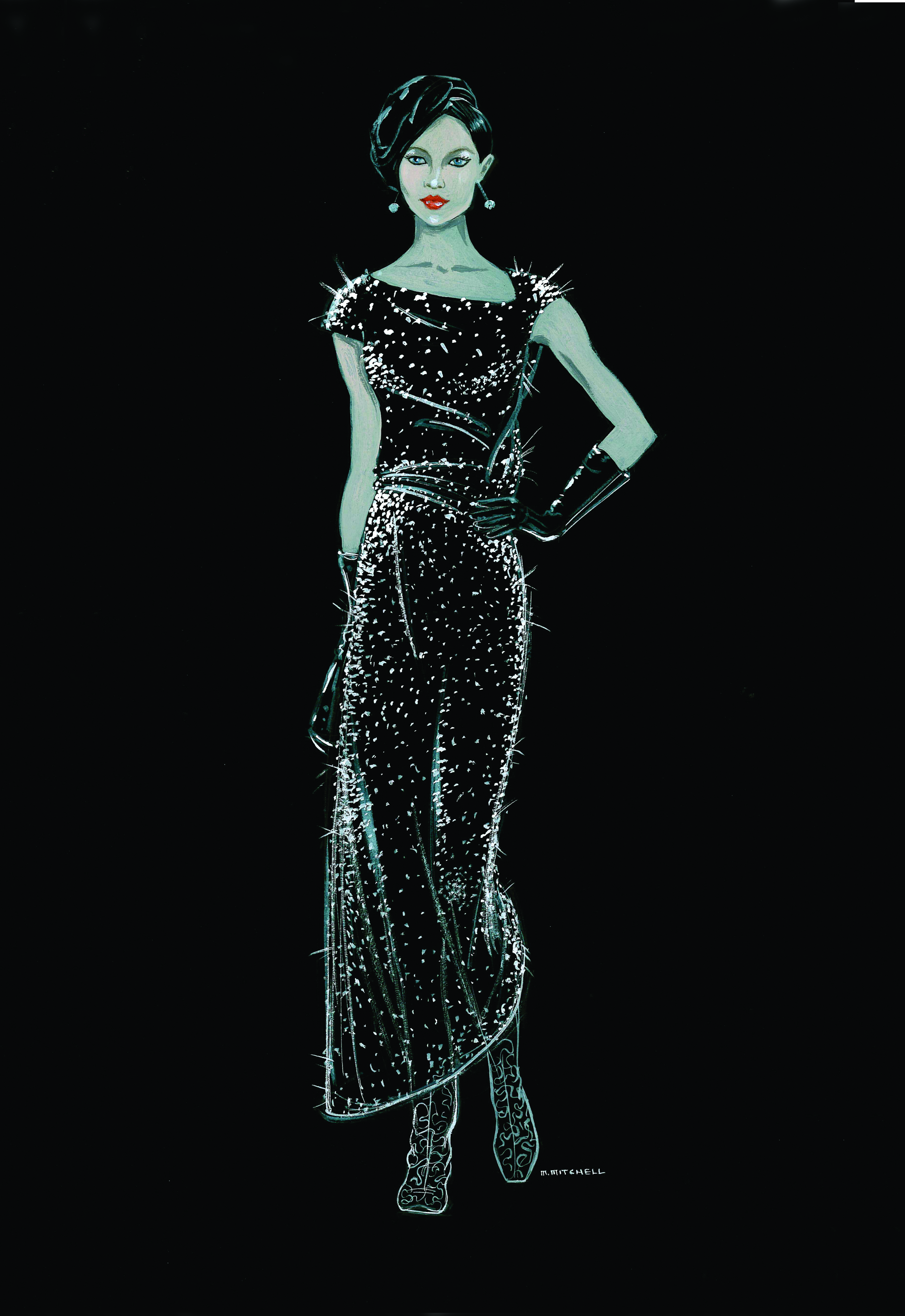 The dynamic sense of flow or movement in Mitchell’s work, then and now, is intentional. “I don’t want it just to be a static figure, I want it to be active.” Besides, to show off the clothes in their best light, she said, “you’re not going to draw the body straight forward, you’re going to give it movement.”