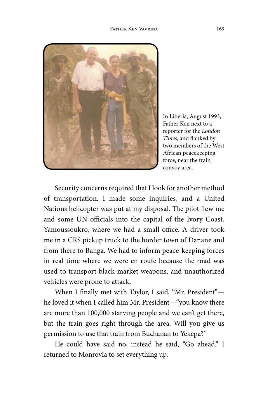 On three occasions Vavrina got Taylor to release a freight train to carry supplies to a large refugee contingent in dire need of food and medicine in the jungle. Taylor provided a general and soldiers for safe passage but Vavrina went along on the first run to ensure the supplies reached their intended recipients.