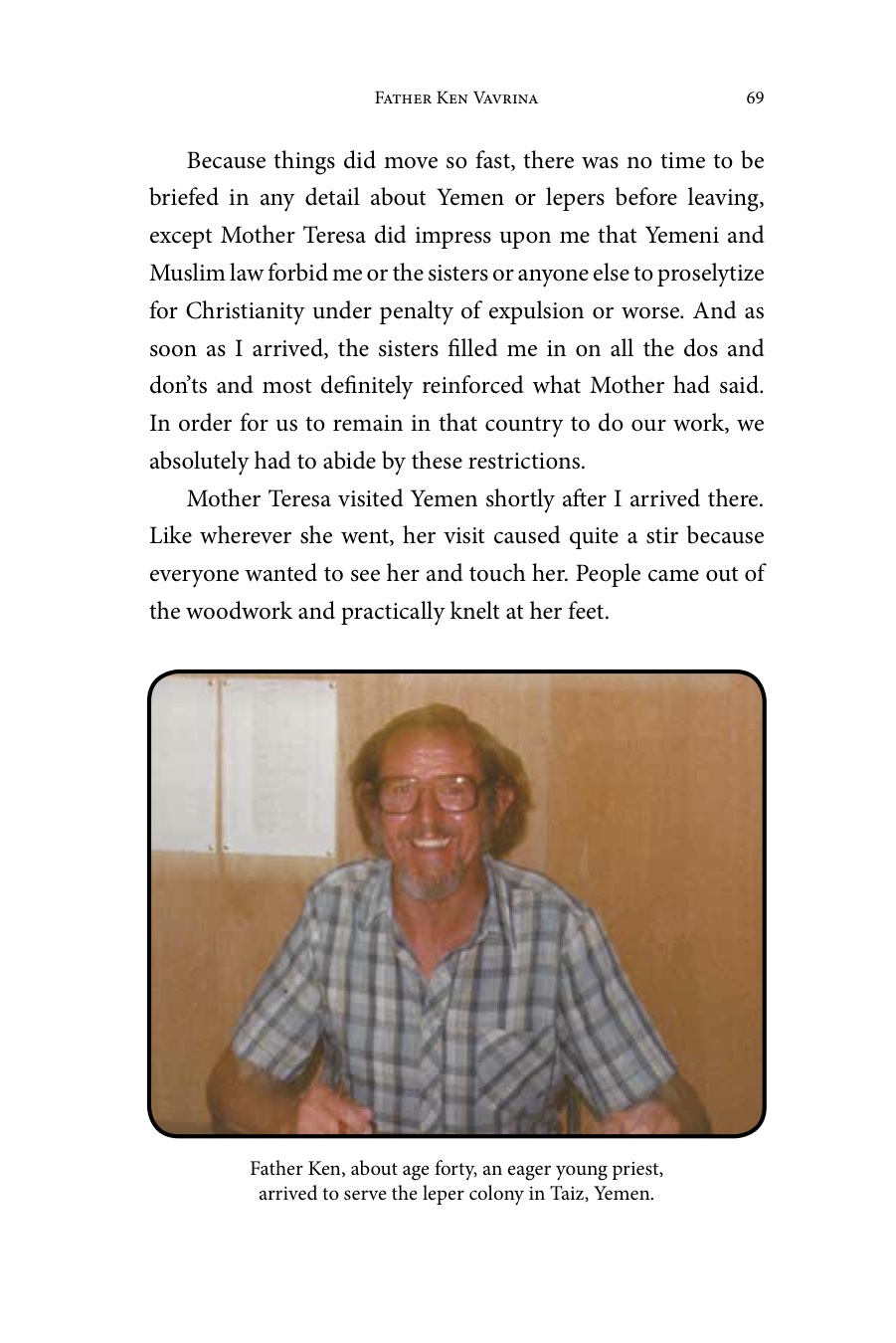 He no sooner found Mother Teresa in Italy than she asked him to go to Yemen, an Arab country in southwest Asia, to work with residents of the leper village City of Light.
